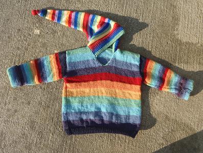 She had requested a long pixie hood on it, but I ran out of yarn. I had just enough to do the jumper itself and I couldn't justify the money for only the hood. So I unpicked the neck of the gnome hat I knitted for Benny last year and simply sewed it on. He hasn't noticed, Rebe is pleased and it was free :-)