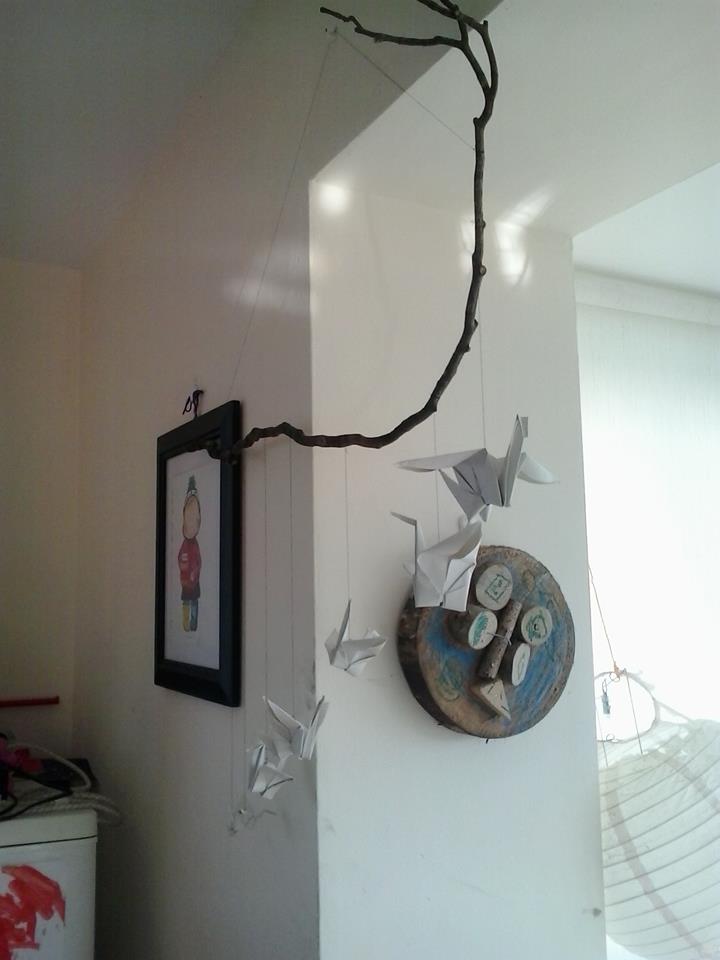 | my painting of Ena, Rebe's origami crane mobile, Benny's wood picture |